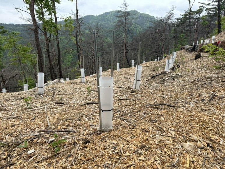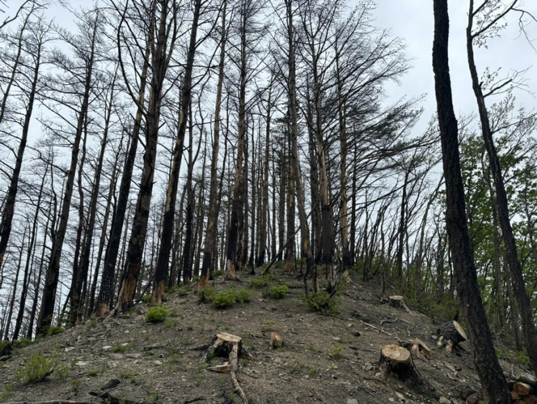 산불의 흔적이 여전히 선명한 숲,